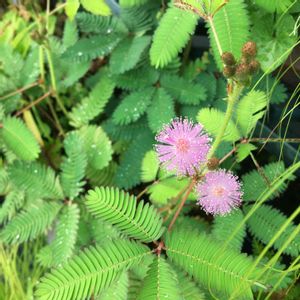 オジギソウ🌸 数年前、一年草と知らず、種を取らずに消滅させた😵ので、今年は種を取りたいです(*^^*) 3株入ったポット苗は150円、植え替えるとよく育つよとお店の人に教えられました。 たくさんツボミがつきました❣️