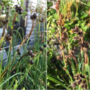 ニワゼキショウの実。見た目のグロテスクさは、可愛らしい花の面影がまるでなし😅。左は昨日夕方、黒くテラテラした丸い姿。一夜明けると右のように開いて🐾種を露出させています。さらに朝の水撒きで濡れたら速攻閉まりました。こやつ生きてます。