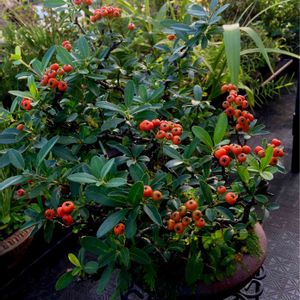 ピラカンサ🍅🍅🍅がだいぶ色づいています。目を離したすきに小鳥さん🦜が全部食べてしまうので、早めに写真を撮りました📸