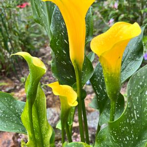 今日のお花✨ カラー✨😊✨ 鉢植えでお迎えして花壇に植えた次の年に開花したpic です😊✨😊 けっこうまっ黄色だったのですが😆 少し薄く写っています🙇💦💦 今年もきれいに咲きますように🙏✨ 昨年7月のpic です🎵