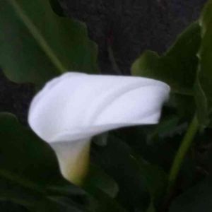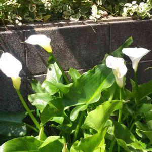 カラー 花言葉 乙女のしとやかさ、清浄 ビニールハウスの裏で咲き始めました 今日の風雪にびっくりしているかも