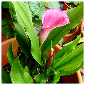 *カラー* ピンクのカラーが、咲きました。白色以外のカラーが、冬越ししたのは初めてです〰️。 💗💗💗