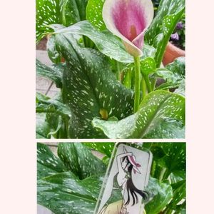 おはようございます。 雨☔あがりました。 我が家のカラーの花 中心が紫 ももこさんに纏って もらいました。 今日も1日明るくね❗