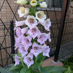 ジキタリス プルプレア キャメロット 咲き進んてきました。けれどすごい風に、揺れています。折れないように、支柱を立てました。覆いかぶさって揺れる南天も、縛りました。