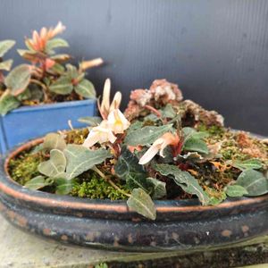 小判鉢のベニシュスランが殺風景なので苔を添えた モッコ鉢のベニシュスランの備前玉の隣にある黒い物体は一昨年小豆島で買った木の化石 私が育てるとどれもこれも矮化してしまうのが悩み