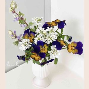 〜職員トイレの花だより〜 NO.7 雰囲気を変えて、大人なアレンジにしてみました🙋♀️ やっと咲いたイベリスと個性的なビオラと。 おっと、グレコマさんも♡