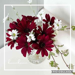 〜職員トイレの花だより〜 NO.6 ブルー系が多かったので、今日は赤❤️ オステオスペルマム アンドロサセ・スターダスト アルストロメリア アイビー 椿の葉