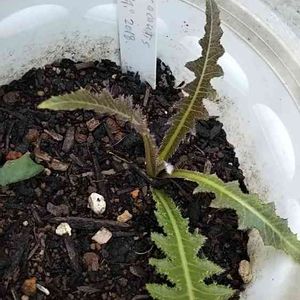 友達に貰ったSonchus acaulis cerraja カナリア諸島グランカナリア島~テネリフェ島原産 多年草 一メートルを越えるロゼットを形成する巨大なタンポポみたいな奴。日本に自生するノゲシの同属で葉はサラダなど、根っこは煎じて珈琲のような飲み物になるらしい。場所が限られてるのでそんな大きな鉢には植えてあげられないけど黄色い花を見られるまで育てられるかな。。