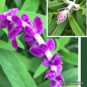 咲き始めました 🟣アメジストセージ🟣 別名 メキシカンセージ メキシカンブッシュセージ 花に細かい軟毛が、ベルベットのような質感💜 植えっぱなしで、大株に 満開時にはかなりの存在感か🟣🟣🟣 シソ科 アキギリ属 原産地 メキシコ 宝石のアメジストのような花から命名 学名 サルビア・レウカンサ 明治時代後期に渡来 花言葉 家族愛 家庭的 (小さな花が寄り添って助け合っているようにみえるから💜💜💜)