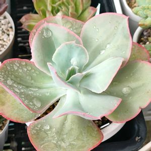 麗春 色鮮やかでふっくらしてきた! 子供の頃からピンクとエメラルドの組み合わせが好きです🌟 あっ!一枚だけ葉が斑入りだ。