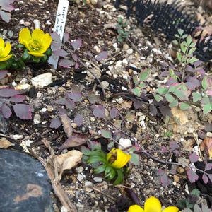 こんにちは😊寒いですね😨2週間ほど前の写真です🤳寒い時期にいち早く咲くセイヨウセツブンソウ🌼ピンクの葉っぱはセリ フラミンゴ🦩私の花壇で爆発的に増えてます😱