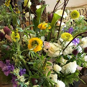 こんばんは🌝 先日、お花のワークショップに行きました。素敵な花屋さんと、教えてもらった(そしてかな〜り手直ししてもらった)作品です。楽しかった✨