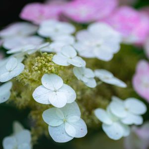撮影地:相模原市 麻溝公園 白とピンクの2種類に見えますが、同じ枝で色変わりしている状態を撮影しました。カシワバアジサイの仲間で、白からピンク、更に赤(ルビーレッド)に色変化する不思議な品種です。白やピンクの部分は装飾花で、黄色部分が本当の花(両性花)です。