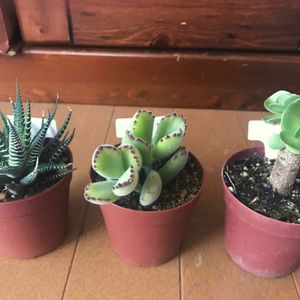 モロコエンシス❤ 春を待たずに植え替えました💦 そして外の多肉部屋に置いてたのですが 後々調べたら、冬は室内の方が良いみたいで 事務所の窓辺に移動となりました😃 元気に育ってくれますように😌💕 手前のこの子はダイソー産。 お名前分かりません〜☆
