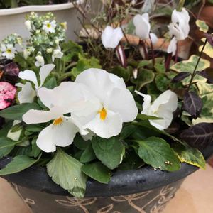 よく咲くスミレ♥︎︎∗︎*゚ ミルクセーキʚ♡⃛ɞ(ू•ᴗ•ू❁) 白の寄せ植え☺️🌱 プリムラメラコイデス🌸初雪カズラ🌸ガーデンシクラメン🌸アリッサム🌸へデラ