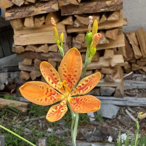 ヒオウギ(アヤメ科) 本州〜沖縄の日当たりのよい山地に生える 葉が扇を広げたような姿からの名③ 思いがけない所に咲いていました 薪の置き場の横にちゃっかりと居座っています どこかからか種が飛んできたのでしょうか? 薪を出すのにあきらかに邪魔な場所ですが 切られないでよかったー💕 ④花後の花弁が若い果実上でクルクルと巻いて残っています ⑤2024.8/30 去年から果実の上のこのクルクルが気になってます😅 木曽おもちゃ美術館 8/4
