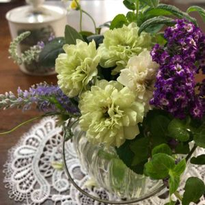 ご機嫌ティータイム☕️ バーガンディさん ミニ薔薇のように咲き始めたので 早い目に✂️ もう終わり直前の ジキタリス ブルーサルビア グリーンアイス 伸び放題の枝を🌿✂️した葉物を合わせて 入れてみました🤗 お庭の花とお茶で😇💞