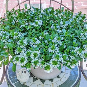 サンクエール ホワイトとブルーグラデーション💐 鉢から溢れ出てモリモリ🌼 毎日カナブンがサンクエールのベッドでくつろいでいます😅 何度隣の空き地にリリースしても、毎日戻ってくる🪲 居心地がいいのかな?