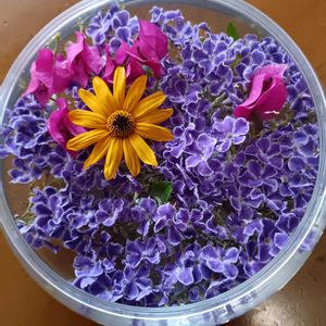 こんばんは〜🌠 今日も一日お疲れ様でした〜( ´ ˘ `)_ _) デュランタ宝塚💜 最後の枝に咲き誇ってたお花今日カット✂️しました🤭😅😁 水差ししても花がパラパラ落ちるので💦 久しぶりに花浮かせしてみました٩(๑^ᴗ^๑)۶♬♪ ピンクのブーゲンビリア🩷と姫ひまわり🌻を入れて 自己満足ですが(≧∇≦)/ 🔖とにかくGS楽しもう! 今日夕方外に出たら風が寒かったですね〜🌀🌀🌀 体調崩さない様にお気をつけ下さいね٩(๑>◡<๑)۶。.:*ฺ✤ฺ