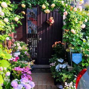 我が家の玄関の薔薇達🌿 左上↖は薔薇の様なクレマチスです。 優しい色合いの同色系でまとめてあります🌿