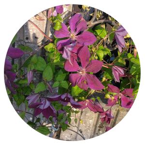 💜クレマチス便り💜 四季咲き 新枝咲き 朝日が 当たってきました☀ 名札 風で飛ばされ 不明😔 判る方 教えて下さい🙇