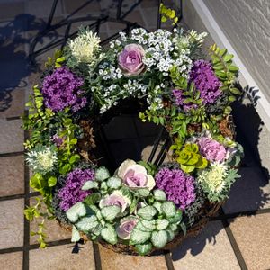 おはようございます 先日購入した大量の苗で、秋冬定番の寄せ植えを作り始めました。 ①葉牡丹リース 今年も、ウインターローズ(葉牡丹のこと、🌷オニヅカバイオファームの井上店長命名)咲きました❣️ ラミウムと、PWアリッサムスノープリンセスが、葉牡丹をローズとして引き立ててくれました。 花材選択として良かったと思います。 ②ビオラスリット鉢 購入して、すぐに植えられなかったので、花枝が伸びてます。花後はカットするので、段々と程よい高さで咲き揃うはず。 次第にラウンドになります。 冬は、花もゆっくり開花なので、花柄摘みも、のんびりで助かります。 春の満開を楽しみに、ゆっくり育成です。 知人へのプレゼント🎁分は、完成 2〜3日養生したら、持参の予定です。 我が家の分も、早く作りたい… 来週末に、リースバスケット初の方と一緒に作るので、暫く、待機苗です😅😅