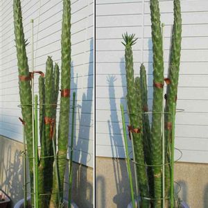 9か月振りの健康診断の姫将軍. 20年近くの紆余曲折の傷は,ほとんど治癒. 背丈は,昨年より約10㎝伸び,全高110㎝に. 外回りリングの支柱ではおぼつかなく,主要な幹に支柱を追加して,リボン止めです. 玄関脇に出したいけど,倒れてかけてとっさに手を出そうものなら,トゲが刺さり,怪我をしそう. 仕方なく,温室奥の片隅で,台風の季節が過ぎるまで過ごしてもらいます. どこまで,丈夫で居られるか,今は根競べです.