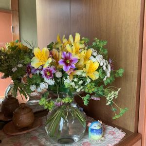 アマビエ様と一緒に 久しぶりの投稿 3月のフラワーアレンジのお花が玄関でまだ頑張ってくれています🍀 いつかお庭で育てたお花が飾れるといいな😊