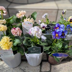 ①神戸ビオラ。。。ちっちゃくて可愛い💓お一人様にしよっと。 ②③89円ビオラさん。。。ちらっと見える💙 色変も期待して😘 寄せ植えしよ〜かなぁ〜 ④華奢な低木好きな私は コプロスマ ビートソンズゴールドもお迎え ⑤フレアーブルー