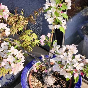 おはようございます🌤️ 父から貰った姫りんご🍎の鉢植えと モミジの鉢植え🍁 りんごの花っこが満開です💮💮 4.5年になるかな🤔 今年は植え替えしたいと思ってます