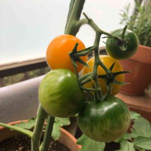 オレンジのミディトマトがいい色になってきました🧡 早く食ベたいところだけど2人兄弟なので、ケンカにならないようにもう一つおいしく色づくまで我慢です😅