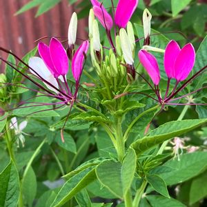 こんなクレオメも咲いた! 濃いピンク🩷 薄いピンクの種から、毎年植えるけど、なぜかたまに色味が違うのもある🤭