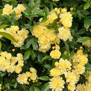 モッコウバラが満開になってきました♪ 何も考えずに狭い場所に植えてしまい、隣りのバラとかなり接近🤣 毎年、モッコウバラらしくない小ぶりに剪定してます😁