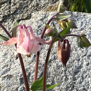 ピンクのオダマキ開花💓 石垣の向こう側のお隣さんから、種がこぼれてうちの敷地内で咲いてます😆 しかもブロックのスキマに! やったー♪ これで、2年目のお花です。