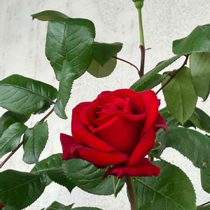 赤いバラ、開花です🌹 このバラ、立派な花を咲かせます。 名前、わからなくて…ごめんよー🙏 しかも、半額のバラ🌹笑 今年は、どのバラも枝っぷりが良く、ツボミもいっぱいついてます。 期待しちゃう〜🤭