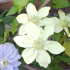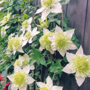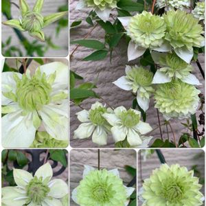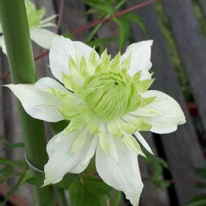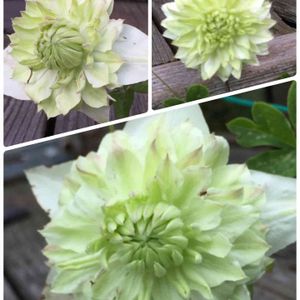 クレマチスの白万重が咲き出しました✨ 春にたくさん咲いたけど、またポツポツ咲き出しました❣️ 黄緑色の可愛いお花…この子も可愛い姿に変身しますよ✨ もっと咲いてくれるかな😊
