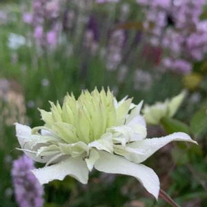 クレマチス'白万重' 雨の合間を縫って、開花が始まりました。花期が長いとのことで、これからどんな表情を見せてくれるのか楽しみです。