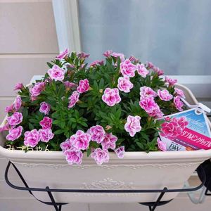 PW スーパーベル ダブルピンクリップル アンバサダーで頂いたお花を飾ってるエリア。 1枠空いてたので、☔にも強い、スーパーベルを仲間に✨ 明日は大雨☔🌀予報😨 過保護に、軒下避難かな……😅