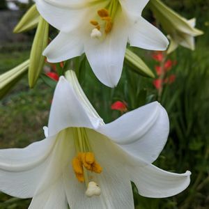 こんばんは〜⭐ 昨年より1週間遅く テッポウユリが咲き出しました〜😍 オレンジは グラジオラスです。 素敵な週末になります様に〜