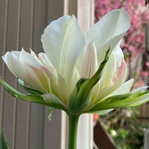 おはようございます☺️ 八重咲きチューリップ ホワイトヴァレー 咲始めはライムグリーンとホワイトの2色咲 4つの球根の内のひとつ寄せ植えに忍ばせたのですが茎が伸びすぎてアンバランスww 全開後もグリーンとピンク色が頬を染めるかのような花弁🥰 …オシャレさんです(*ˊᵕˋ*)੭ ੈ 上から見るとチューリップ⸜には見えなくて🌷︎⸝