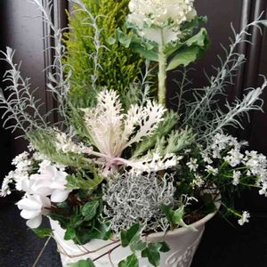 昼間は小春日和の一日でした 白い寄せ植えで 遊んでみました! 今年初めての寄せ植え 難しいです! コニファー エレモフィラ ニベア 宿根イベリス ガーデンシクラメン 葉ボタン プラティーナ ヘデラ