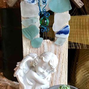 孫の海に行きたいに応え海へ☔️💧 梅雨の海は荒々しく🌊💦 こわばってしまった孫でしたが シーグラスを見て💎 きれいと言って✨✨✨ 拾い持ち帰りました。 木工市で購入したハウスに貼って見ました 青いピックも雰囲気を出してくれました✨ はやく、雨が止んで 青空が戻りますように(*´꒳`*)🙏