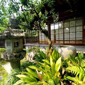 おはよう🌅 今日もLove&peaceな1日を ジャパネスク・パート4 モンステラと明治の硝子戸と灯籠 日本人だなぁ、、、 (^_−)−☆