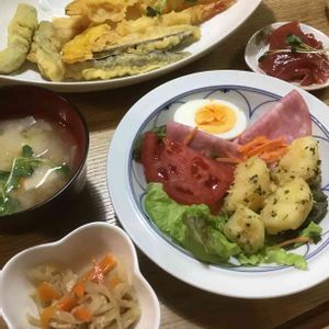 お嫁さんの お母さん、九州から 神奈川に 到着 ❗️ その日の 夕食 。 天ぷらだけ 近くの スーパーで 買って来ました‼︎‼︎ 😅 息子ん家 小鉢が 少ないので、 とにかく 小鉢類 足して〜❗️ 食器棚も あまり 入らないし、無理 かも 。。 小鉢 が 欲しい‼︎ ワンプレート で 出すのかな⁇ 作る料理 が 違うのかな⁇ 分からない事が 多いが 、聞かない事に している 。。 この小さい小鉢 と 小皿は 以前 私が あげたんだけど ね〜 。。