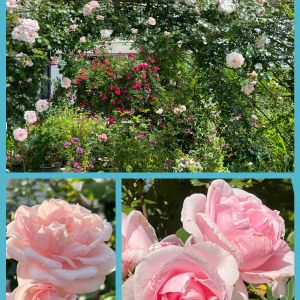 我が家のつるバラ ニュードーンがたくさん咲きました 庭の車庫のの屋根の下で、柔らかなピンクの花が溢れて 奥の赤いキングのバラと🌹、競演しています🌸🌸🌸