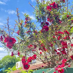 ギョリュウバイ(御柳梅) 別名: レプトスペルマム マヌカ ご近所のお家のギョリュウバイ、楽しませてもらっています。 🏷️真っ赤な火曜日 マヌカ→ニュージーランドの先住民族マオリ語でギョリュウバイを意味します。 蜂蜜はマヌカハニーと呼ばれ世界的に広く知られています。 私がマヌカハニーを買い求めたきっかけはGSで知ったからです。 フトモモ科 原産地: オーストラリア、ニュージーランド 花言葉: 「蜜月」「華やいだ生活」