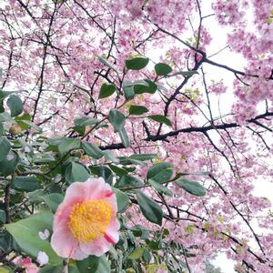 河津桜と斑入りのツバキ、八重咲のツバキも咲いています
