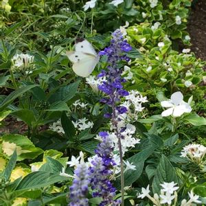 サルビアと白い蝶✨ 紫のサルビアと白いお花たちが咲いているところにモンシロチョウがふわふわ🎶 公園をお散歩にて✨