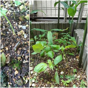 一昨年裏庭に植えたミョウガ。昨年は茎3本育ち、ミョウガの収穫は5個ほどでした。 今年は茎が9本出てきたので、ミョウガも沢山収穫できるかな? プランターで育てている大葉の種が余っていたので、ミョウガの周りに蒔いてみました。 湿々の裏庭も、この子達には居心地がいいようで、すくすく育っています♥️