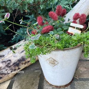 【キャットテール】 『キャッツテール メメ』 ハンギングと考えていましたが、ブリキ鉢も可愛いかも❗️と… 『ビオラ タイガーアイ』が入っていた鉢に 植えっぱなしのクローバー&セダムを剪定して入れ込みました😊 (植え込み1週間ぐらい) 垂れ下がってきたら可愛いかも〜😍💕